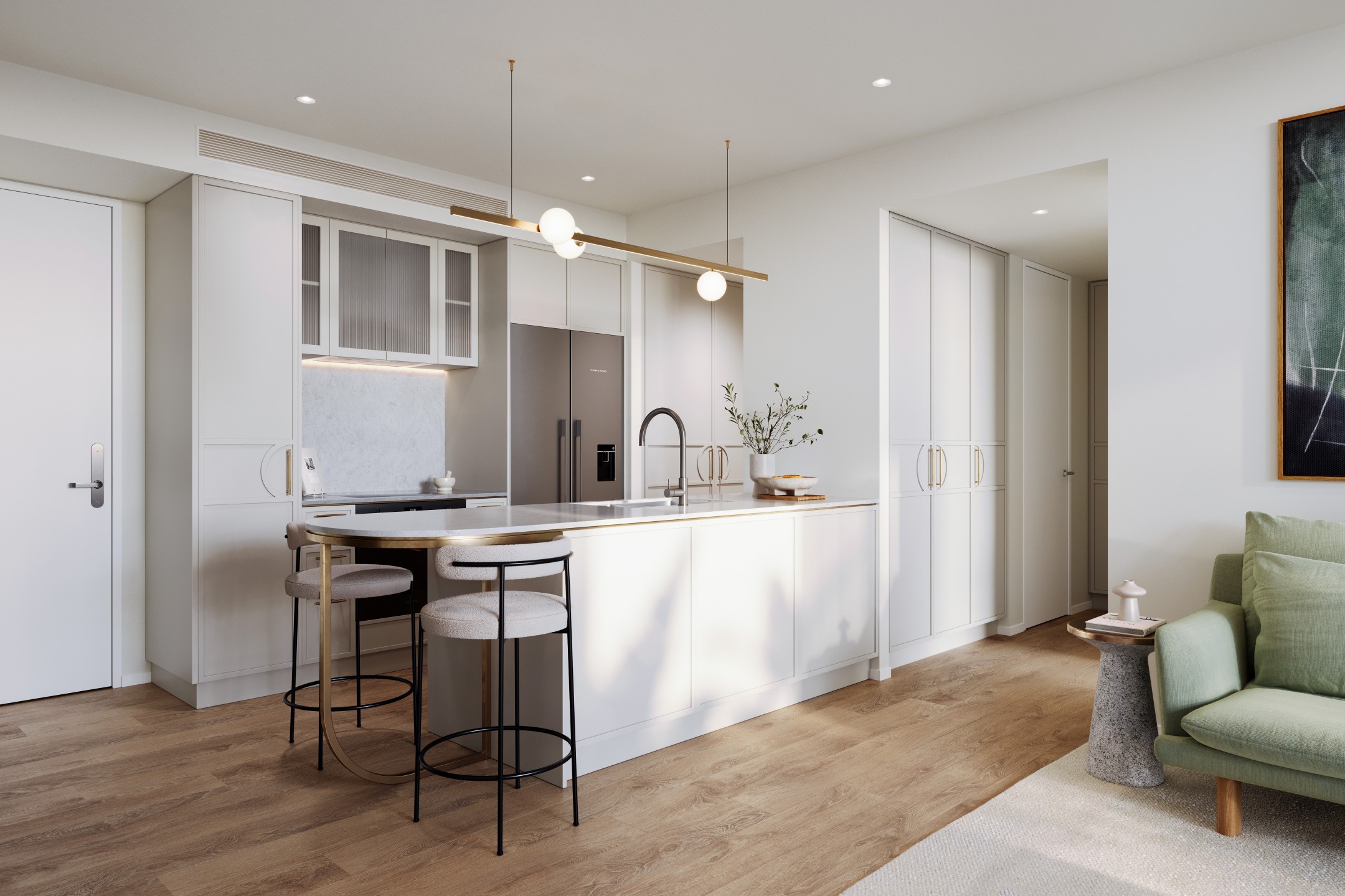 Oria 共規劃 132套Art Deco風格公寓,分布於15層光感充足的空間之上,提供寬敞的 2、3、4房戶型及空中豪宅。設計細節考究,從弧形天然石材中島、黃銅飾件到拱形鋼框窗戶,每一處都彰顯獨特格調。